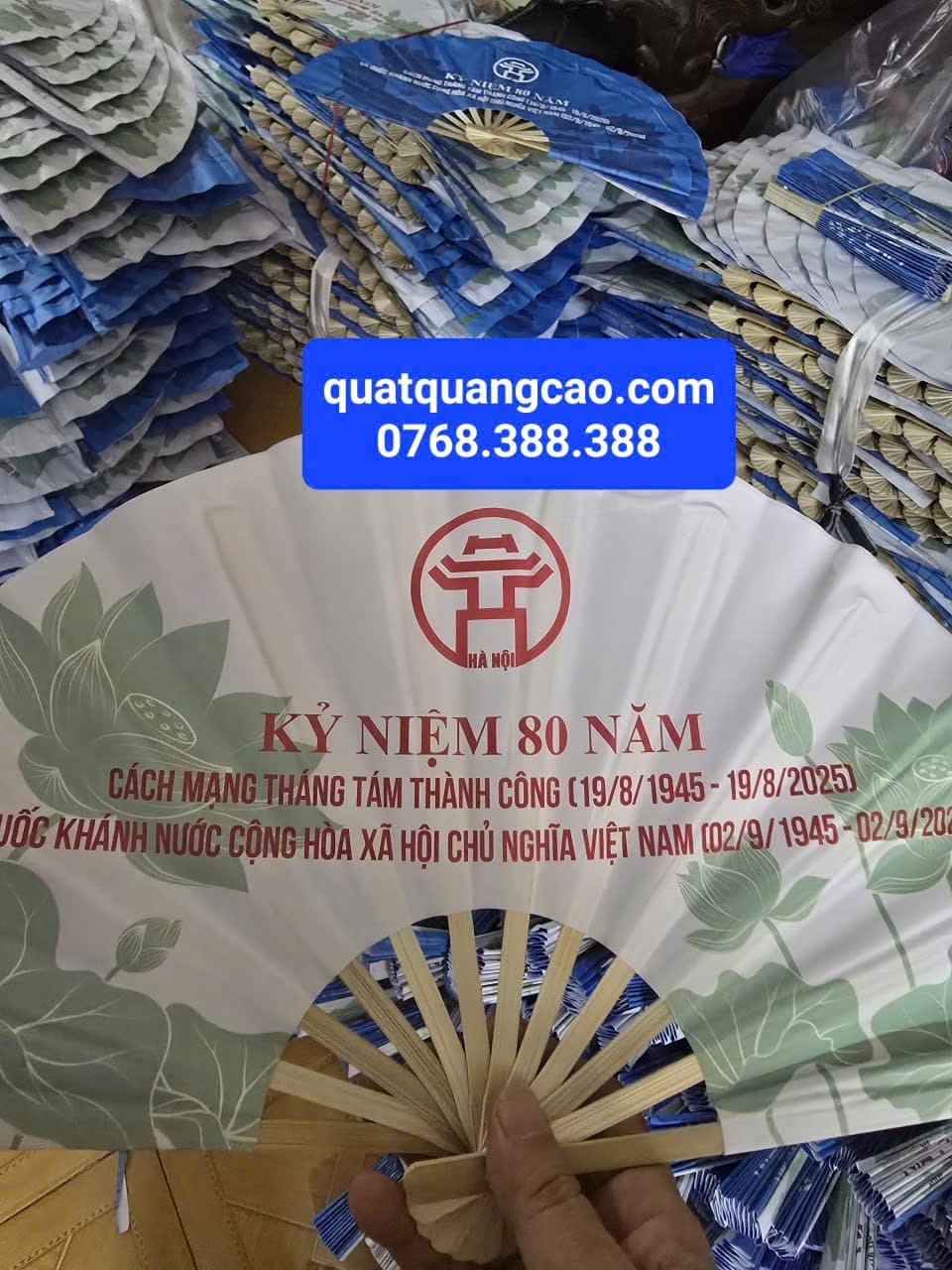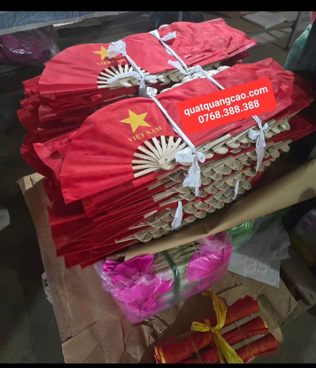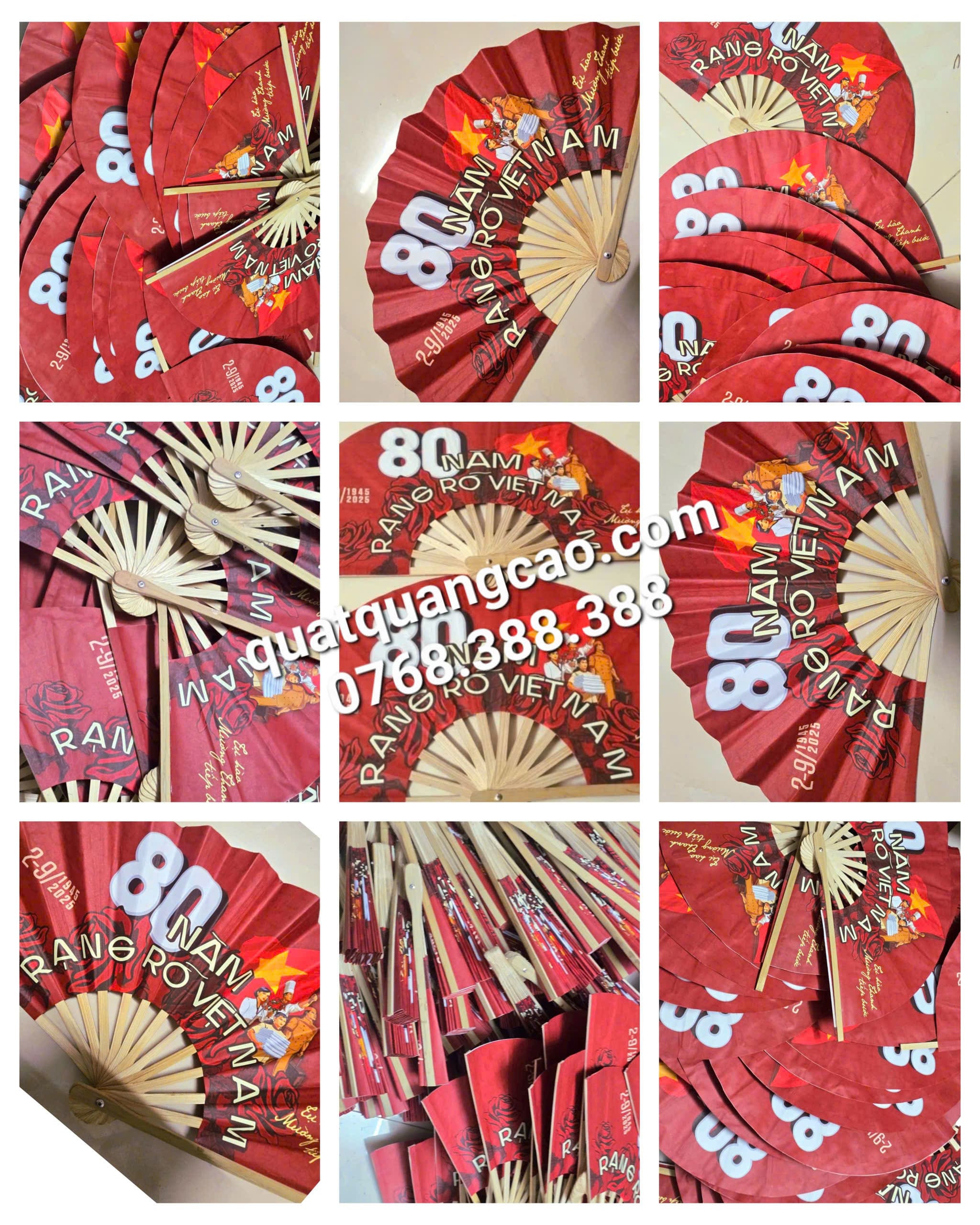 Đính kèm một số hình ảnh quạt giấy, quạt vải cao cấp quatquangcao.com đã thực hiện cho sự kiện chào mừng 50 năm giải phóng Miền Nam và 80 năm Quốc khánh Việt Nam: quat cờ Việt Nam và quạt A80.