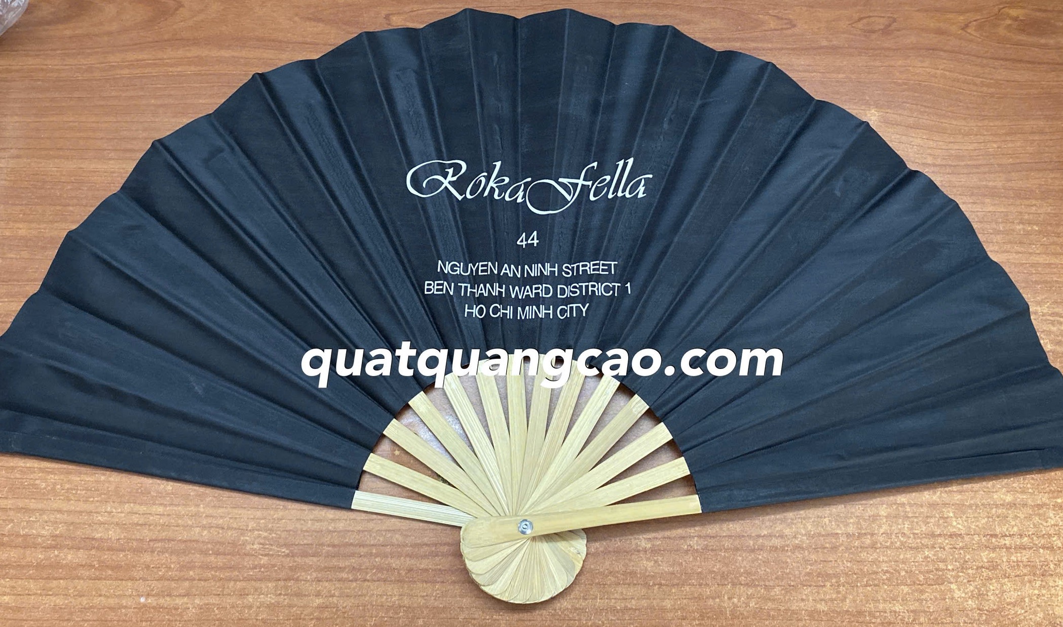 Quạt quảng cáo nan tre vải lụa nền đen đẹp sang trọng, dùng làm quà tặng sự kiện khai trương, món quà tặng ý nghĩa